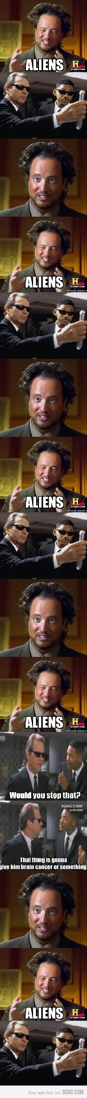 Natürlich ist es hochspekulativ, an den Haaren herbeigezogen und wissenschaftlich nicht haltbar. Die Sendung hat aber dennoch einen hohen Unterhaltungswert, weil es schon etwas spooky ist, dabei aber versucht seriös zu wirken, was aber gründlich misslingt. Anfangs geben noch relativ seriös wirkende Physiker ihre Statements wie „Extraterrestrial life is possible!“ ab, aber je fortgeschrittener die Sendung, desto verrückter die Aussagen. Und spätestens, wenn der Sprecher seinen Satz mit „Ancient aliens theorists believe, that..“ beginnt und ein gewisser Giorgio A. Tsoukalos mit seinen Erklärungen anfängt, geht es ans Eingemachte! Tsoukalos beantwortet in der Sendung alle Fragen mit „Alien“. Für wen wurden die Nazca Linien angelegt? ALIENS! Wer hat die Manna-Maschine gebaut, die den fliehenden Juden aus Ägypten 40 Jahre in der Wüste Nahrung gab? ALIENS! Wen stellen die Kachinas (Götter aus dem Himmel) der Pueblo-Indianer dar? ALIENS! Wer flog die Vimana – Fahrzeuge mit denen sich die indischen Götter im Himmel bewegen konnten? ALIENS! …und deswegen gibt es im Internet den Ancient Aliens Meme. Beispiel?